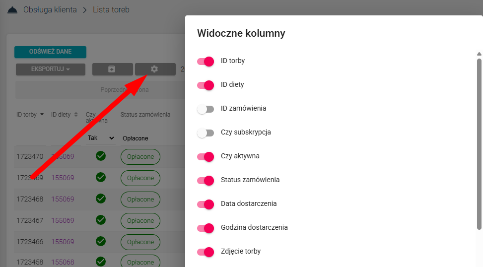 Klikając ikonę koła zębatego, wyświetlisz panel wyboru widoczności kolumn.