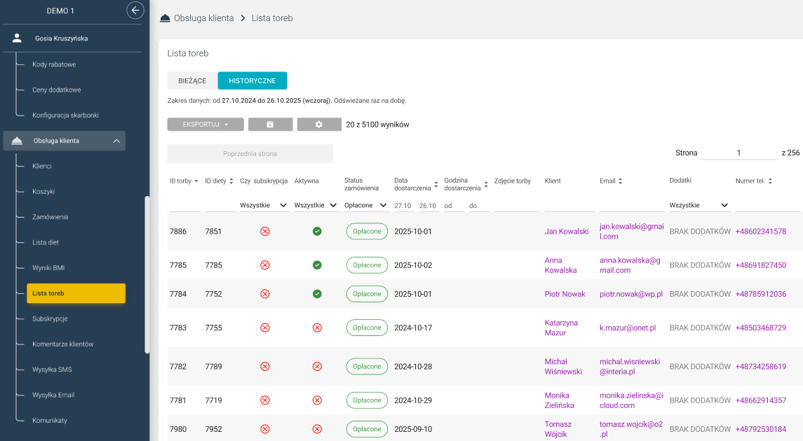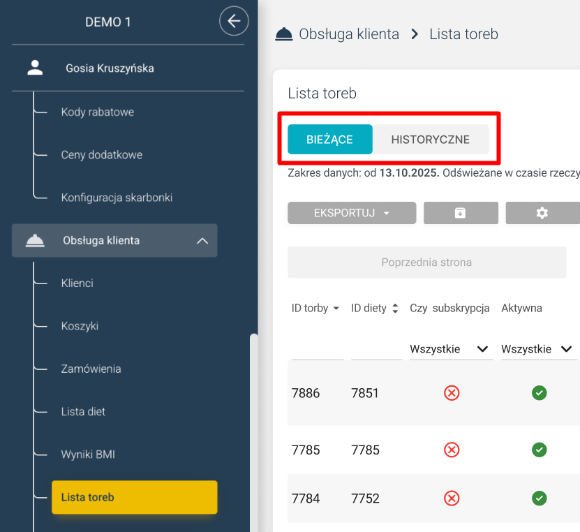 Widok "Historyczne" pozwala na wyświetlenie archiwalnych toreb.