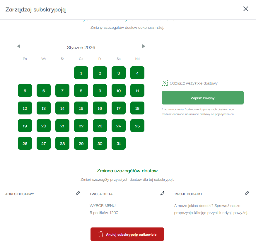 Następnie na widoku szczegółów subskrypcji możliwe będą zmiany dla wszystkich przyszłych dni.