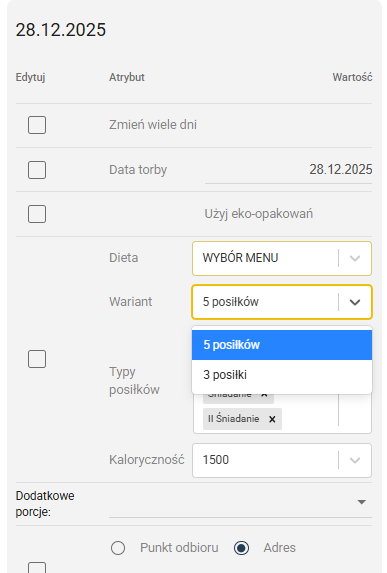 Następnie możemy edytować dietę i/lub wariant posiłku na torbie.