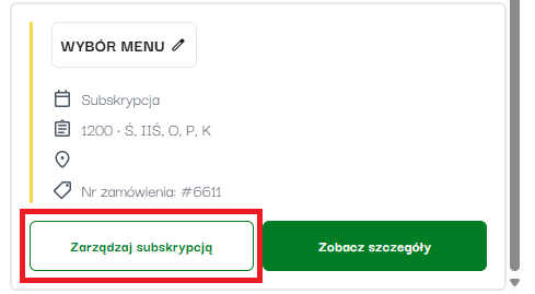 W przypadku subskrypcji, aby zmienić dietę/wariant/kaloryczność na wszystkie przyszłe dni subskrypcji, należy na podszyciu pod klienta wejść w "Moje zamówienia", wybrać dietę z subskrypcją i kliknąć "zarządzaj subskrypcją".