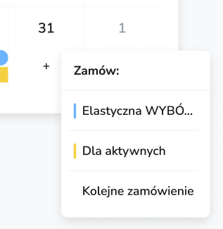 W kalendarzu, w dniach bez aktywnych zamówień możesz kliknąć ikonkę "+", aby odnowić jedną z aktywnych diet lub utworzyć zamówienie na nową dietę: