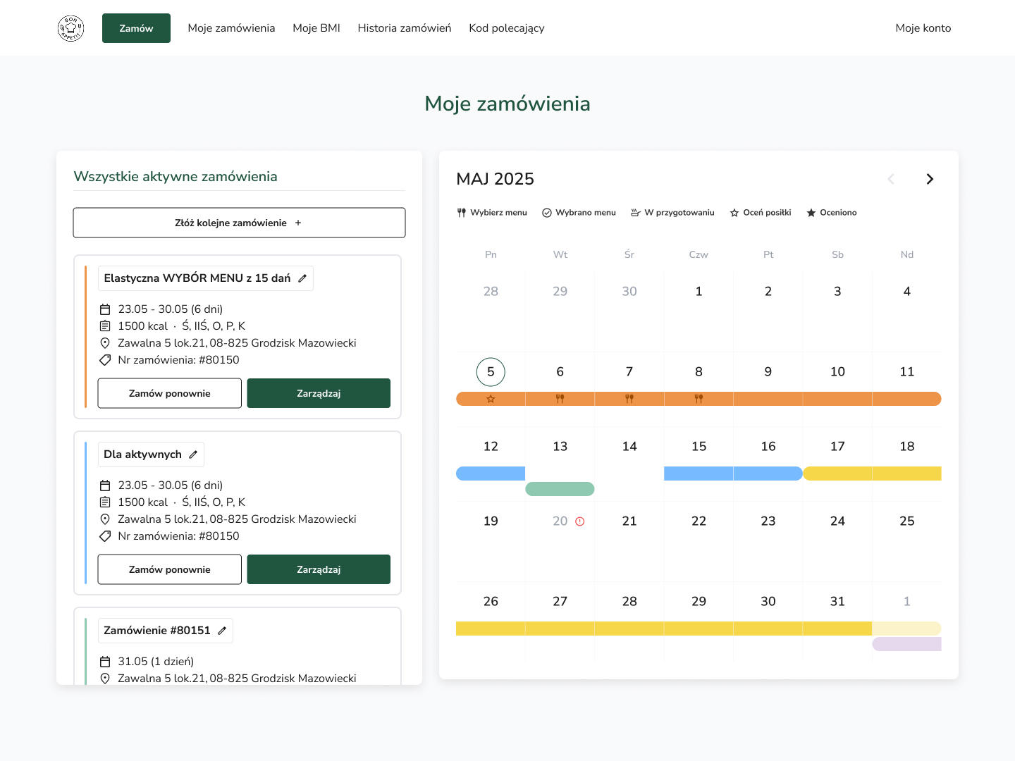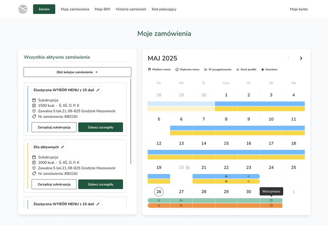 W panelu po lewej znajdziesz listę aktywnych zamówień, a po prawej - kalendarz. W kalendarzu widoczne są wszystkie aktywne diety, a każda z nich ma swój unikalny kolor dla lepszej czytelności.