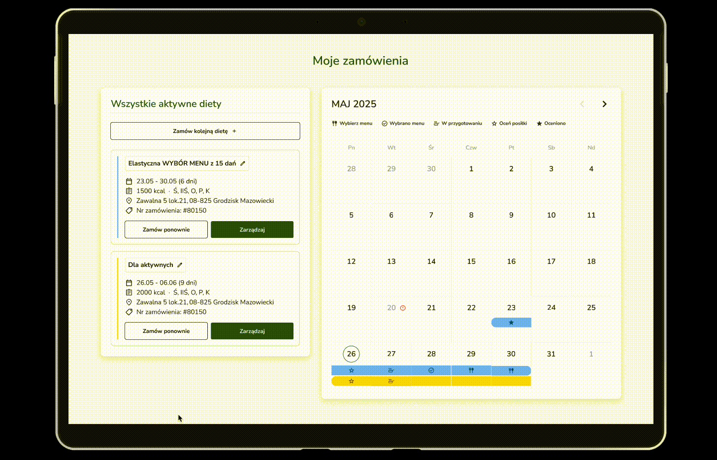 Moje zamówienia - kalendarz zamówień klienta