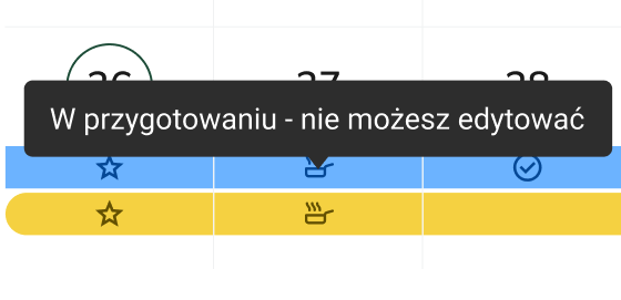 W kalendarzu, w zależności od statusu danego dnia zamówienia będą wyróżnione ikonami. Po najechaniu kursorem, wyświetli się komunikat, co dokładnie oznacza dana ikona statusu (np. "W przygotowaniu - nie możesz edytować", "Prośba o ocenę zamówienia" albo "Subskrypcja wstrzymana"). Poniżej kilka przykładów jak to wygląda w praktyce:
