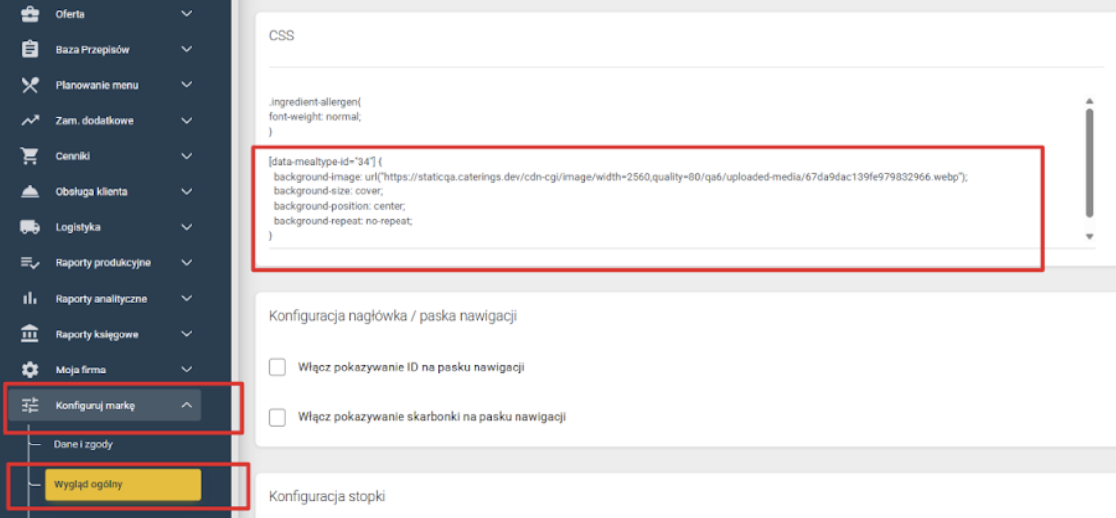 Znając data-mealtype-id przechodzimy do Panelu Admina do zakładki Konfiguracja marki > Wygląd ogólny > CSS: