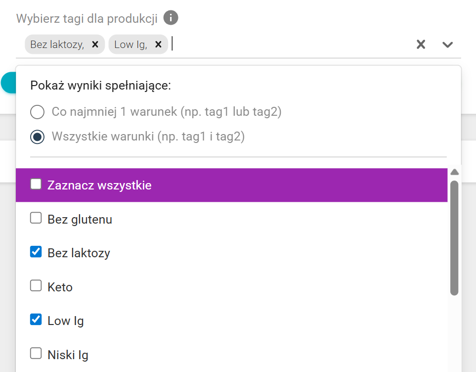 - Wszystkie warunki - wybranie tej opcji spowoduje wygenerowanie na liście przepisów zawierających wszystkie wybrane tagi (np. tylko przepisy zawierające tag zarówno "Bez laktozy" oraz "Low IG)